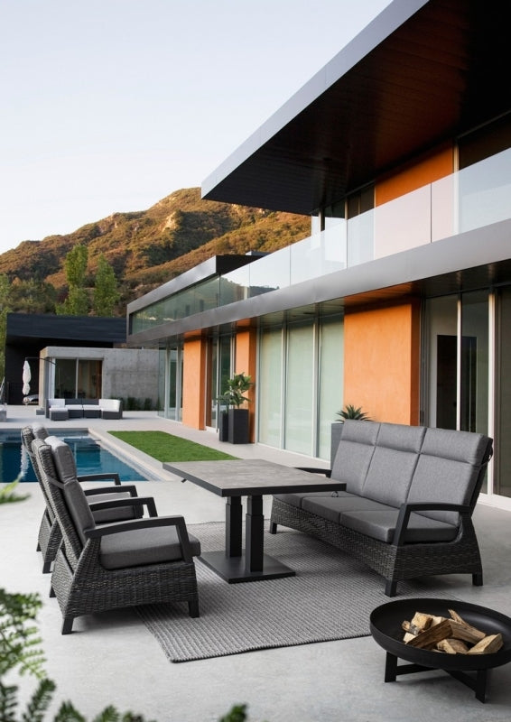 Die frei verstellbare Rückenlehne ermöglicht individuelle Sitz- oder Liegepositionen und bietet dadurch maximalen Komfort. Die abnehmbaren Kissen sind mit einem Olefin-Bezug (100% Polypropylen) ausgestattet, der wasserabweisend und UV-beständig ist.