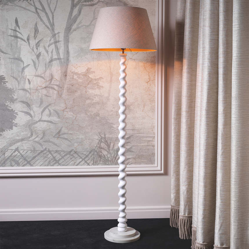 Diese hochwertige Stehleuchte vereint klassische Proportionen mit edler Materialität. Der gedrechselte Holzstandfuß in Weiß verleiht der Leuchte eine elegante, schlanke Silhouette, während der runde Sockel aus weißem Marmor für Stabilität und einen luxuriösen Akzent sorgt. Abgerundet wird das Design durch einen großzügigen Textilschirm, der ein warmes, harmonisches Licht erzeugt und eine angenehme Atmosphäre schafft.