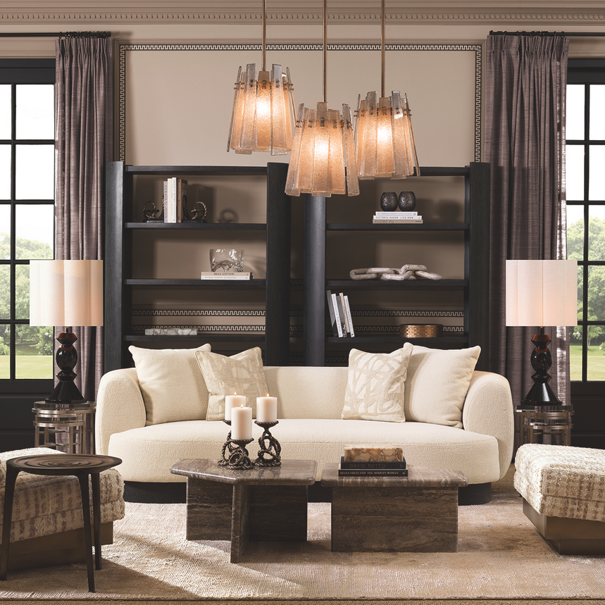 Diese exklusive Pendelleuchte vereint handwerkliche Raffinesse mit zeitlosem Design. Gefertigt aus handgemachtem, zweifarbigem Zuckerglas, erzeugt sie ein sanft diffuses, einladendes Licht, das dem Raum Wärme und Tiefe verleiht. Die fein strukturierte Glasoberfläche bricht das Licht auf elegante Weise und schafft eine atmosphärische, hochwertige Wirkung.