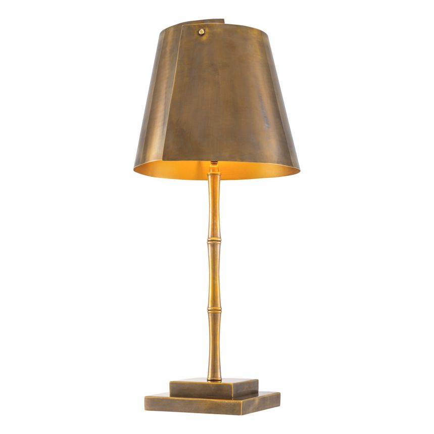Diese elegante Tischleuchte vereint klassisches Design mit natürlicher Inspiration und wird zum stilvollen Blickfang in jedem Wohnraum. Der schlanke, bambusinspirierte Standfuß in edlem Vintage-Messing-Finish verleiht der Leuchte eine zeitlose Ausstrahlung, während der fein gearbeitete Metallschirm für ein warmes, angenehmes Licht sorgt.