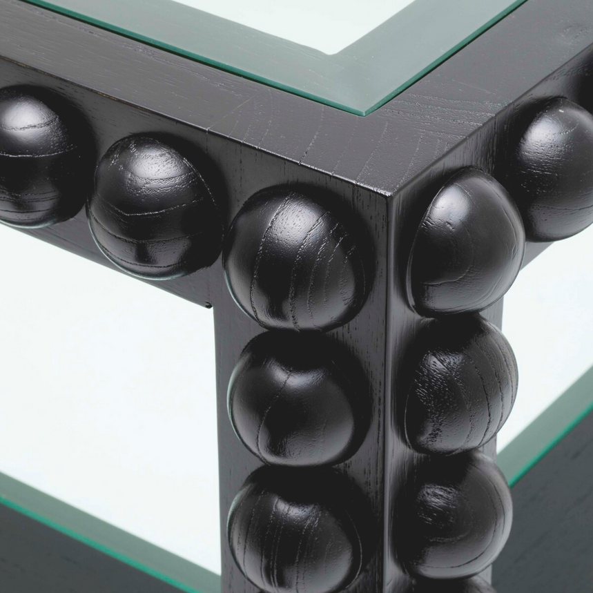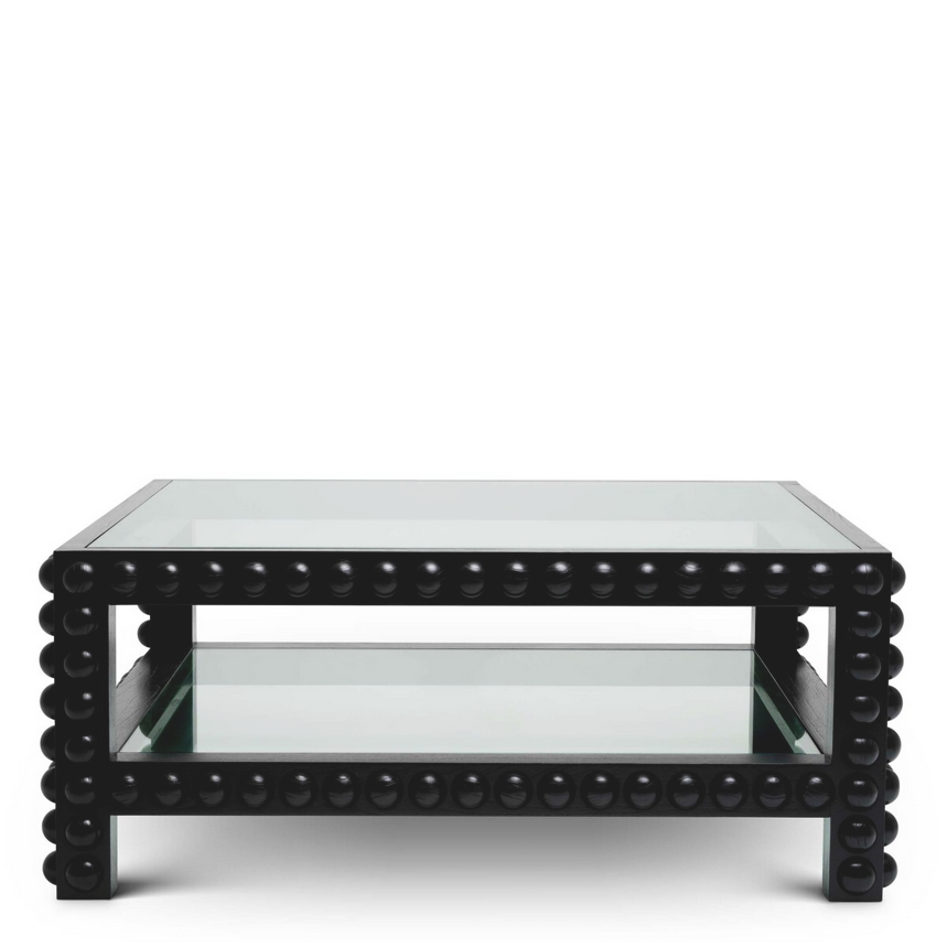 Dieser hochwertige Couchtisch verbindet traditionelle Handwerkskunst mit edlem, zeitlosem Design. Gefertigt aus massivem schwarzem Holz, besticht der Tisch durch seine markanten, halb-runden Schnitzdetails entlang des Rahmens. Diese kunstvollen Elemente verleihen dem Möbelstück Tiefe, Struktur und eine elegante, klassische Ausstrahlung. Die klare Glasplatte rundet das Design ab und sorgt für eine leichte, moderne Balance.