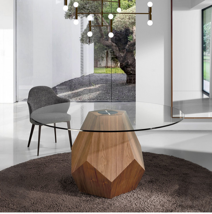 Dieser moderne runde Esstisch kombiniert transparente Eleganz mit natürlicher Wärme. Die feste Tischplatte aus gehärtetem Glas trifft auf eine markante Holzkonstruktion aus Walnussfurnier und schafft ein ausgewogenes Design zwischen Leichtigkeit und Stabilität. Durch seine harmonische Form eignet sich der Tisch ideal als zentraler Treffpunkt im Esszimmer oder offenen Wohnbereich.