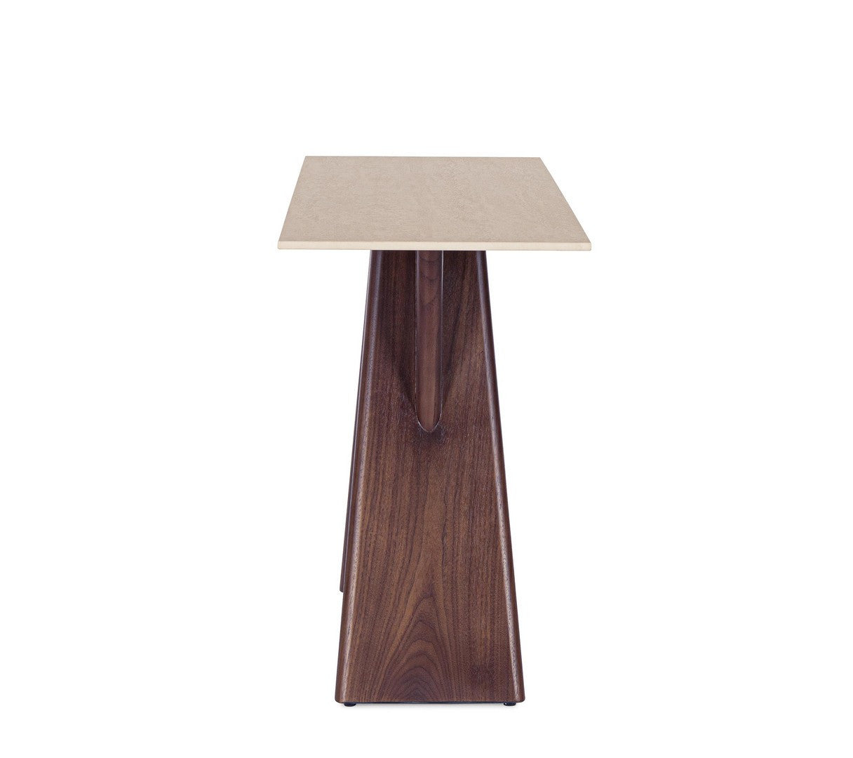 Diese edle Konsole vereint natürliche Eleganz mit moderner Formensprache. Die Tischplatte aus hochwertigem Feinsteinzeug im Travertin-Effekt verleiht dem Möbelstück eine luxuriöse Ausstrahlung, die an edle Natursteinoberflächen erinnert – pflegeleicht und zugleich stilvoll.