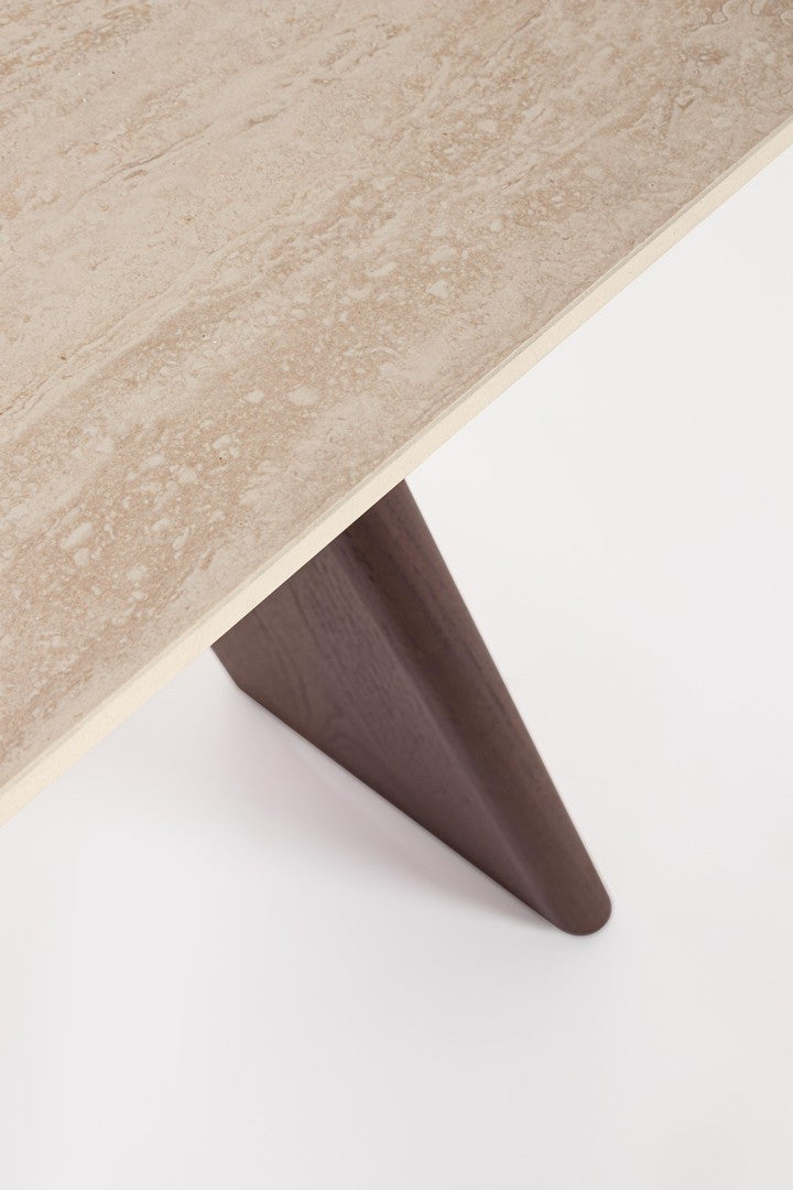 – Tischplatte: Feinsteinzeug mit Travertin-Effekt