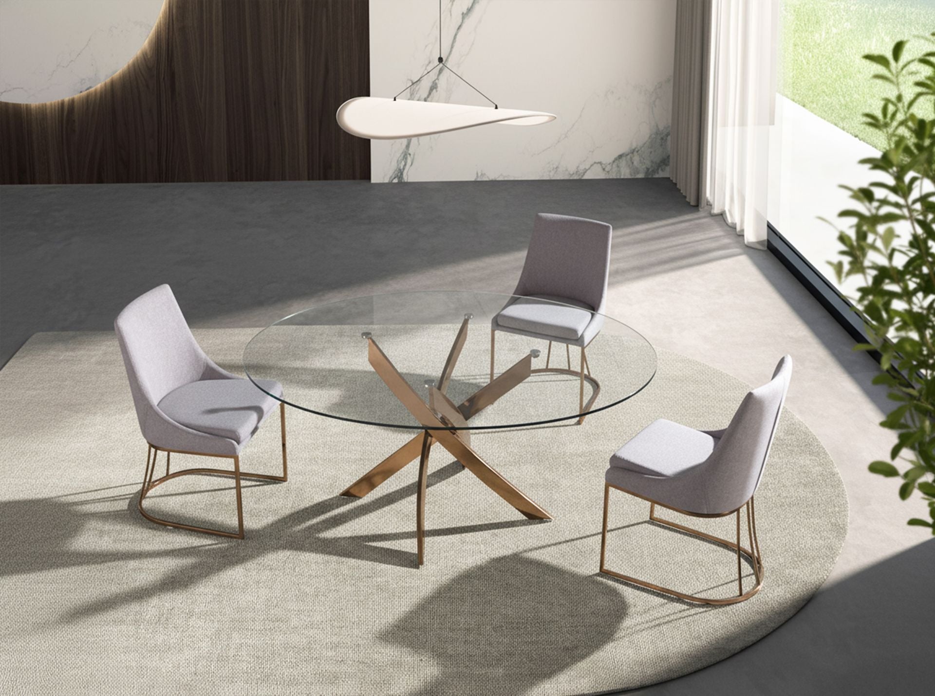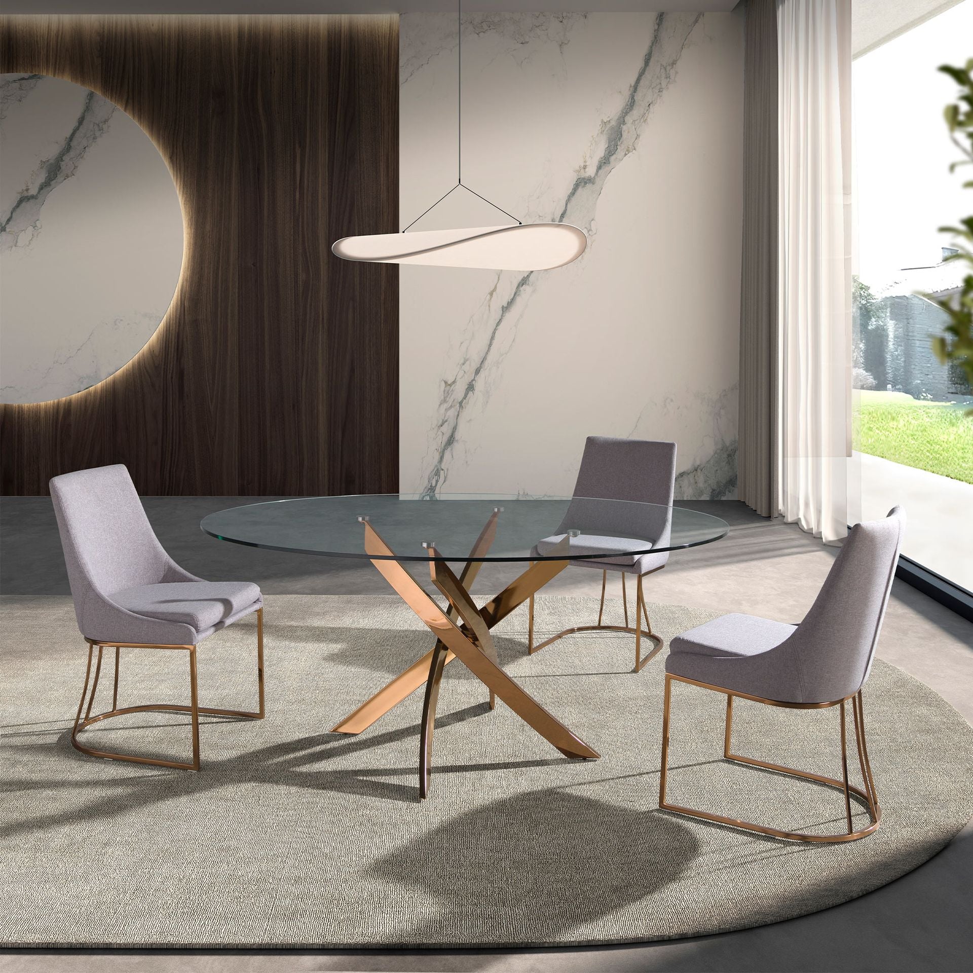 Moderner runder Esstisch mit fester Platte aus gehärtetem Glas. Die originellen, roségoldfarbenen Beine aus verchromtem Edelstahl sind Schlüsselelemente seines Designs.