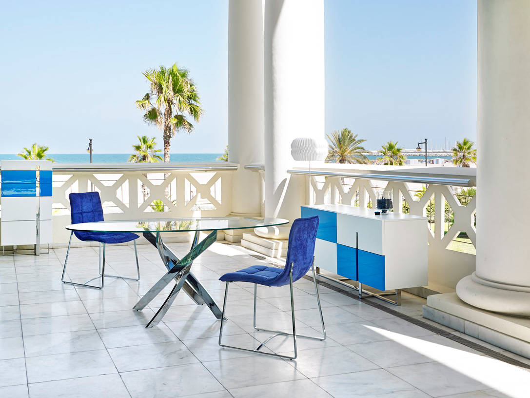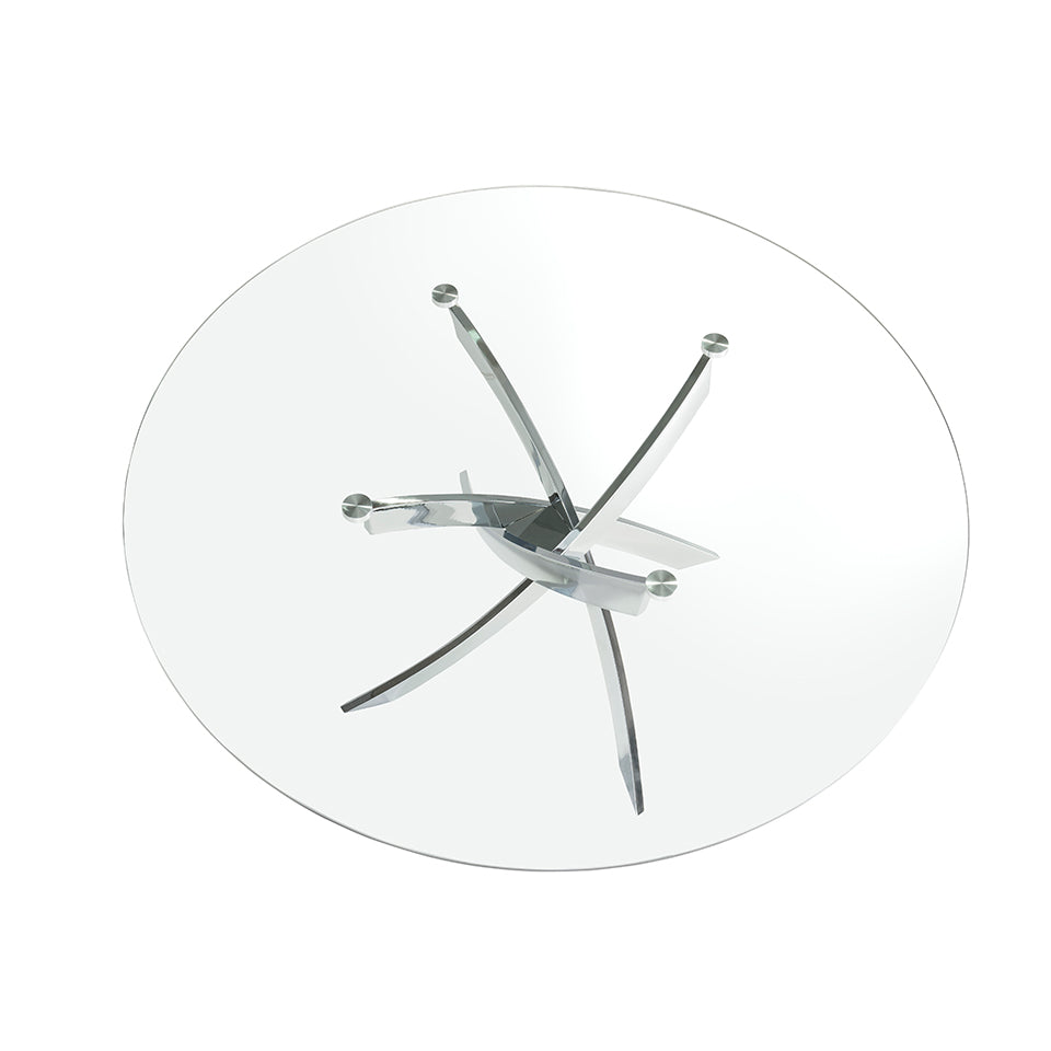 Die transparente Glasplatte sorgt für optische Leichtigkeit und lässt Räume größer und heller wirken. Das hochglanzpolierte Edelstahlgestell in Chrom-Optik reflektiert das Licht und verleiht dem Tisch eine luxuriöse, moderne Ausstrahlung.