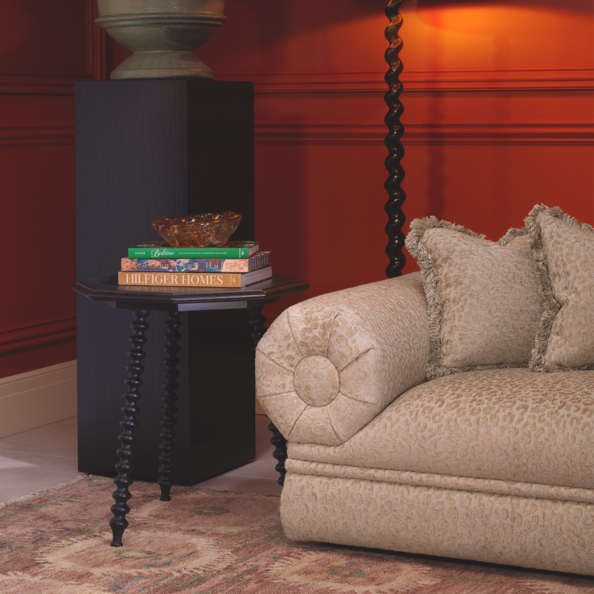 Dieser außergewöhnliche Beistelltisch ist ein ausdrucksstarkes Designobjekt mit skulpturalem Charakter. Gefertigt aus massivem Mahagoniholz und veredelt mit einem edlen schwarzen Lackfinish, verbindet das Möbelstück klassische Handwerkskunst mit einer markanten, zeitlosen Formsprache. Die kunstvoll gedrehten Tischbeine verleihen dem Design Tiefe, Dynamik und eine elegante, fast architektonische Wirkung.