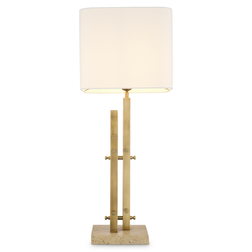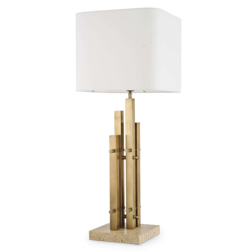 Diese exklusive Tischleuchte vereint architektonische Klarheit mit zeitloser Eleganz. Der charakteristische Sockel in Vintage-Messing-Finish besteht aus vertikal angeordneten Metallelementen, die dem Design Tiefe und Struktur verleihen. Abgerundet wird die Leuchte durch einen hellen, geometrischen Stoffschirm, der das Licht weich streut und eine warme, wohnliche Atmosphäre schafft.