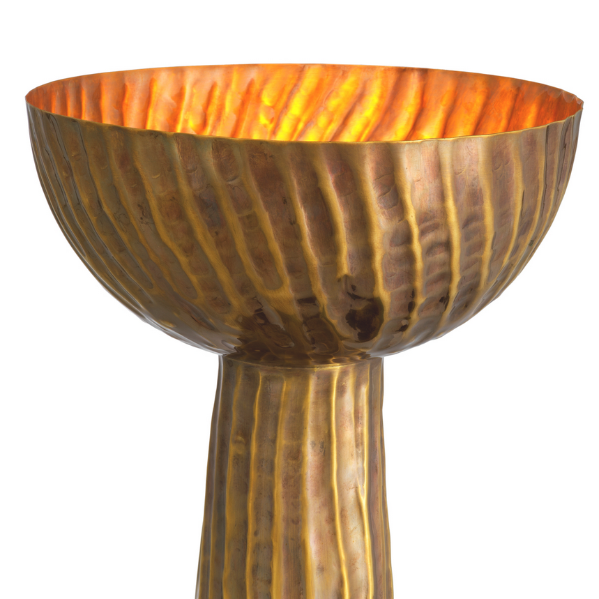 Diese markante Tischleuchte überzeugt durch ihr kraftvolles, skulpturales Design und eine hochwertige Materialauswahl. Der strukturierte Leuchtenfuß in Vintage-Messing-Finish verleiht der Leuchte eine architektonische Präsenz und unterstreicht ihren luxuriösen Charakter. Die klare, kelchförmige Silhouette wirkt zugleich modern und zeitlos, während das warme Metallfinish das Licht elegant reflektiert und für eine angenehme, stimmungsvolle Beleuchtung sorgt.