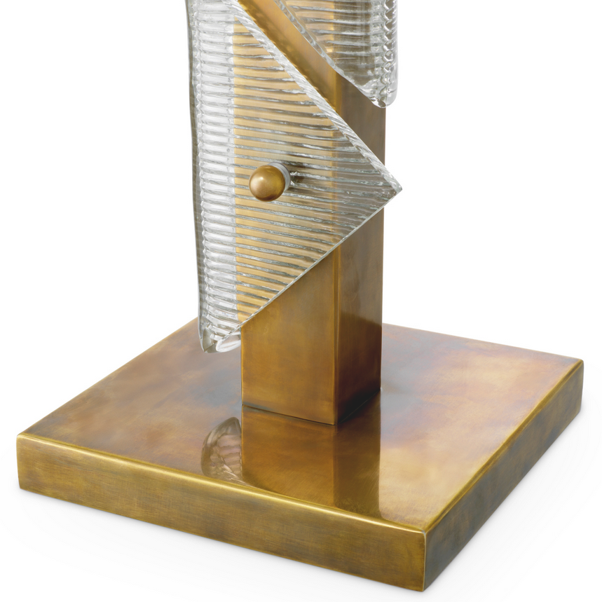 Diese exklusive Tischleuchte vereint kunstvolle Handwerkskunst mit einer klaren, vertikalen Silhouette. Der Leuchtenfuß in warmem Vintage-Messing-Finish bildet eine elegante Basis, die durch filigrane, handgefertigte Glaselemente rhythmisch akzentuiert wird. Diese zarten Glasdetails brechen das Licht subtil und verleihen der Leuchte eine besondere Tiefe und Raffinesse. Der großzügige Textilschirm sorgt für eine weiche, gleichmäßige Lichtverteilung und schafft eine angenehme, wohnliche Atmosphäre.