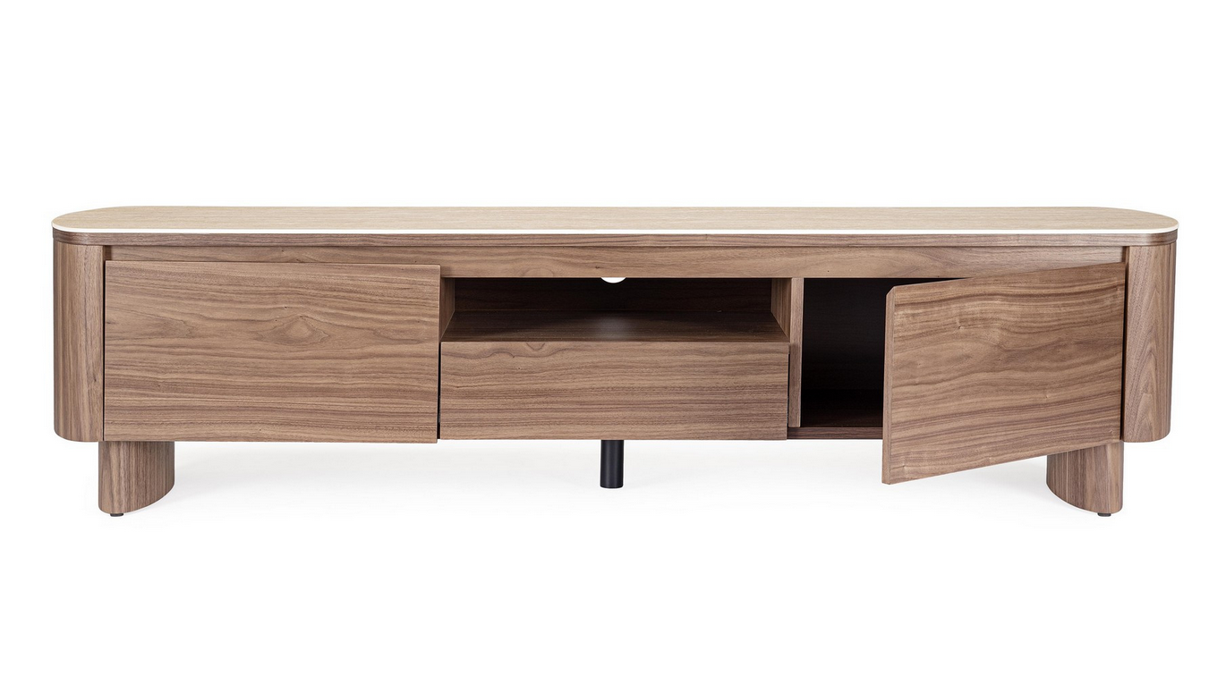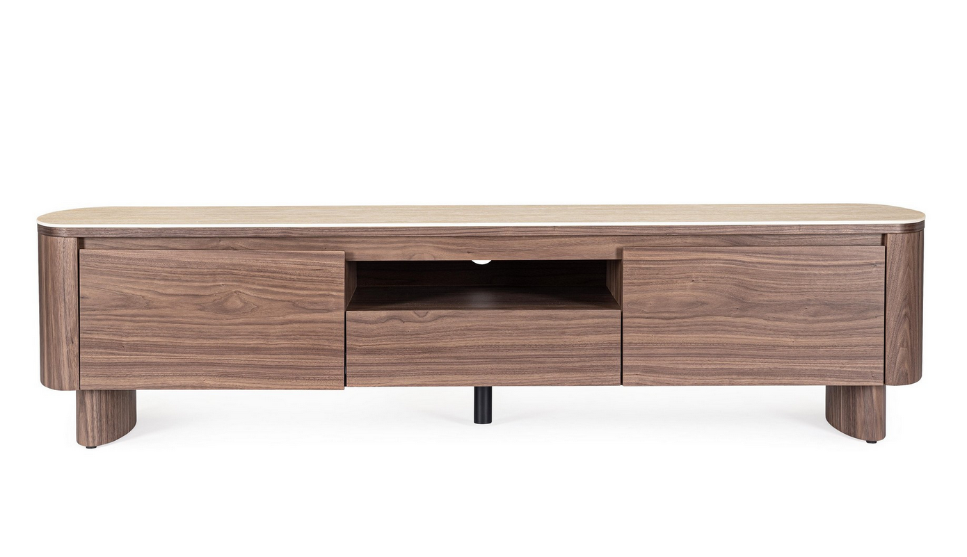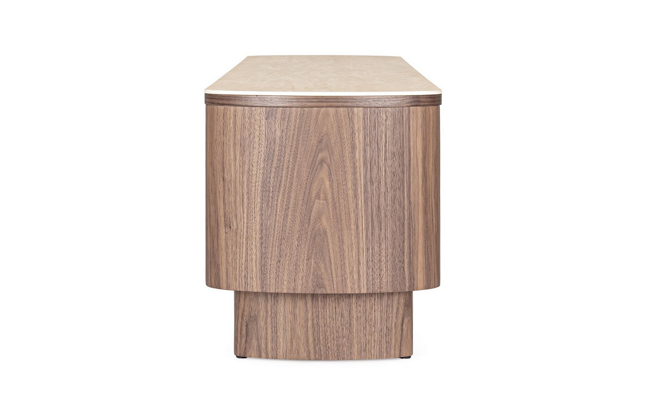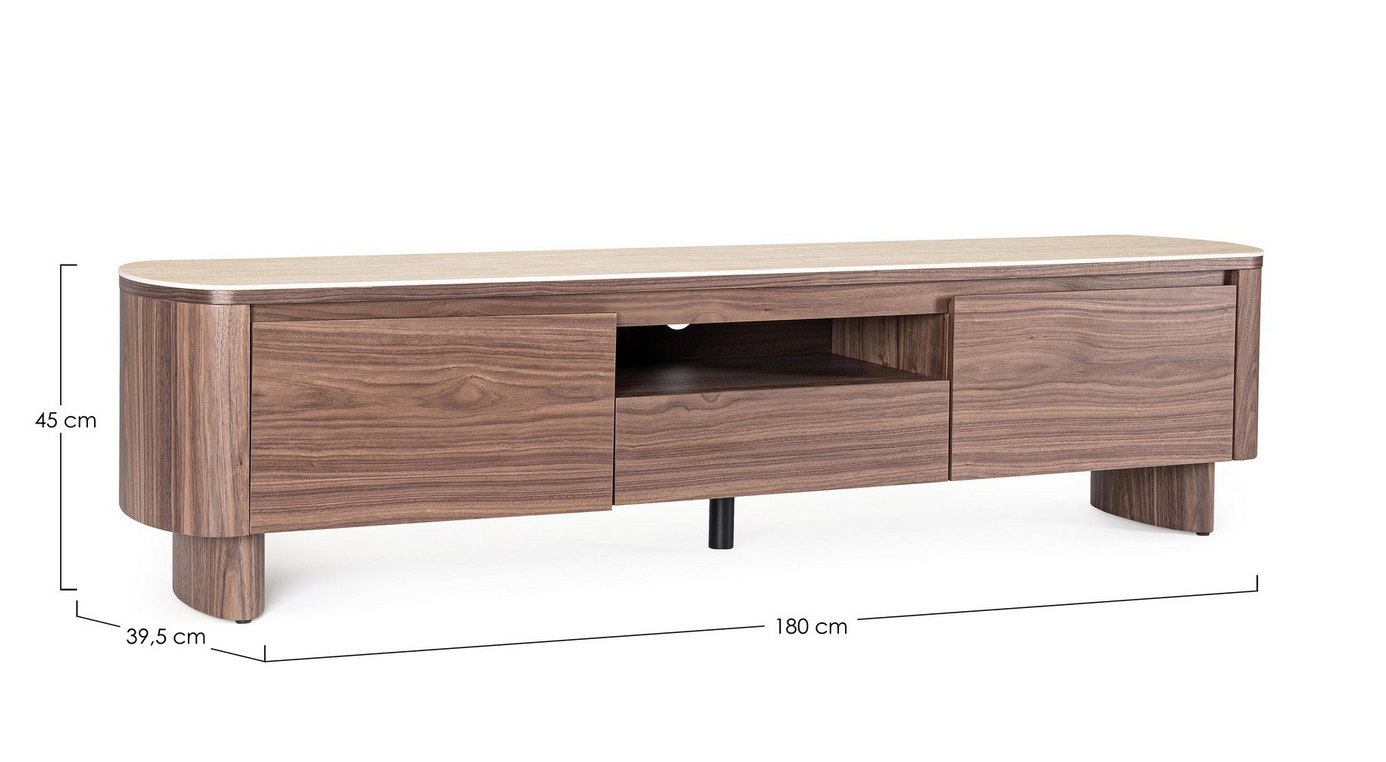 Dieses elegante TV-Board vereint warme Walnussholz-Töne mit einer stilvollen Platte aus gesintertem Stein im Travertin-Effekt – perfekt für alle, die ein hochwertiges und zugleich modernes Möbelstück suchen. Die Struktur und Beine bestehen aus MDF mit Walnussfurnier, geschützt durch eine Oberfläche auf Polyurethanbasis.