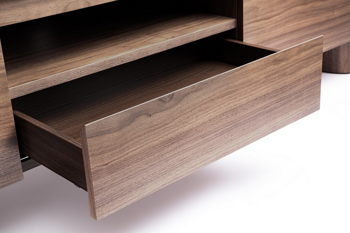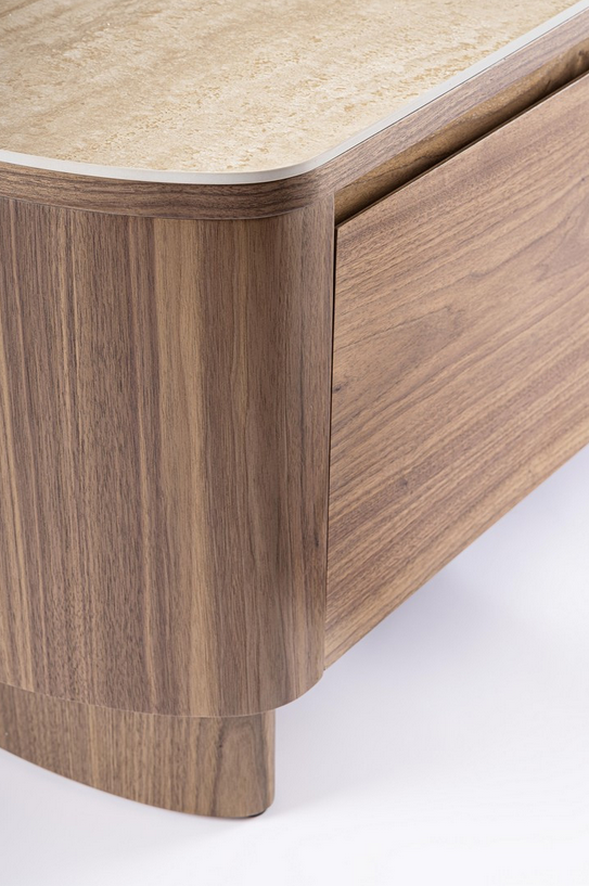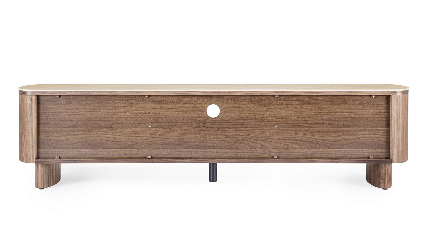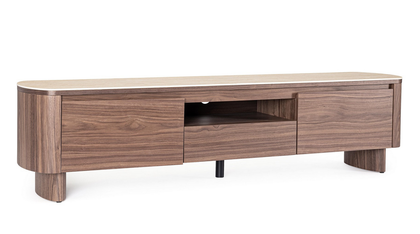Dieses elegante TV-Board vereint warme Walnussholz-Töne mit einer stilvollen Platte aus gesintertem Stein im Travertin-Effekt – perfekt für alle, die ein hochwertiges und zugleich modernes Möbelstück suchen. Die Struktur und Beine bestehen aus MDF mit Walnussfurnier, geschützt durch eine Oberfläche auf Polyurethanbasis.